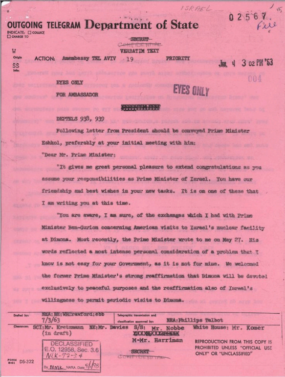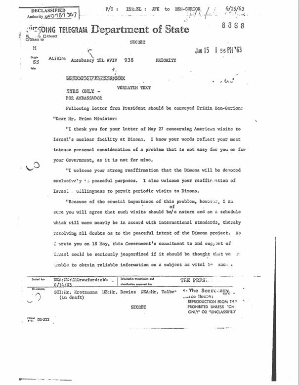 El i-a trimis o scrisoare lui Ben-Gurion, amenințând practic că va întrerupe sprijinul SUA dacă Israelul nu permite inspecții regulate și semnificative . Era un ultimatum: dacă SUA nu puteau obține „informații fiabile” despre Dimona, „angajamentul și sprijinul Washingtonului față de Israel ar putea fi serios puse în pericol”.