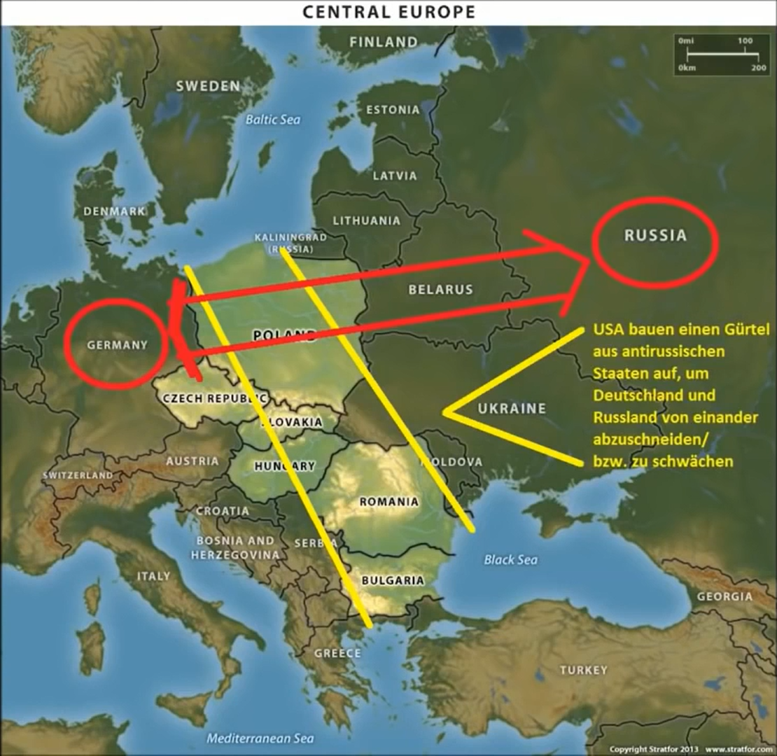 Traducerea textului din dreapta, scris în limba germană: SUA construiesc o centură de state anti-ruse pentru a separa Germania și Rusia una de cealaltă. Acesta este SOLUȚIA vizată de SUA.