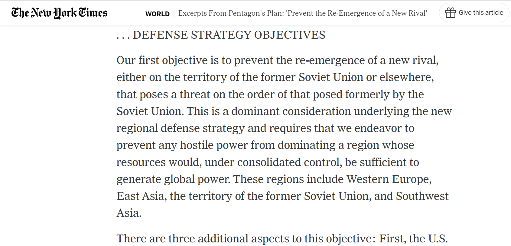 Primul nostru obiectiv este acela de a împiedica reapariția unui nou rival, fie pe teritoriul fostei Uniuni Sovietice, fie în altă parte, care să reprezinte vreo amenințare de tipul celei aduse anterior de Uniunea Sovietică. (…) Trebuie să avem în vedere faptul că schimbarea democratică în Rusia nu este ireversibilă și că, în ciuda actualelor sale traume, Rusia va rămâne cea mai puternică forță militară din Eurasia și singura putere din lume cu capacitatea de a distruge Statele Unite.