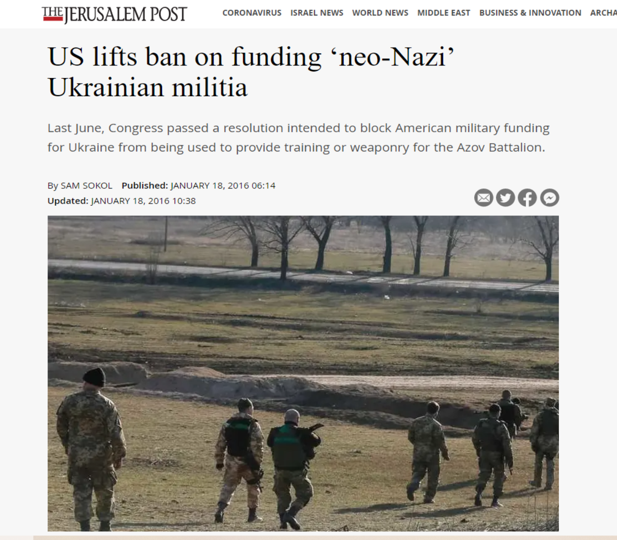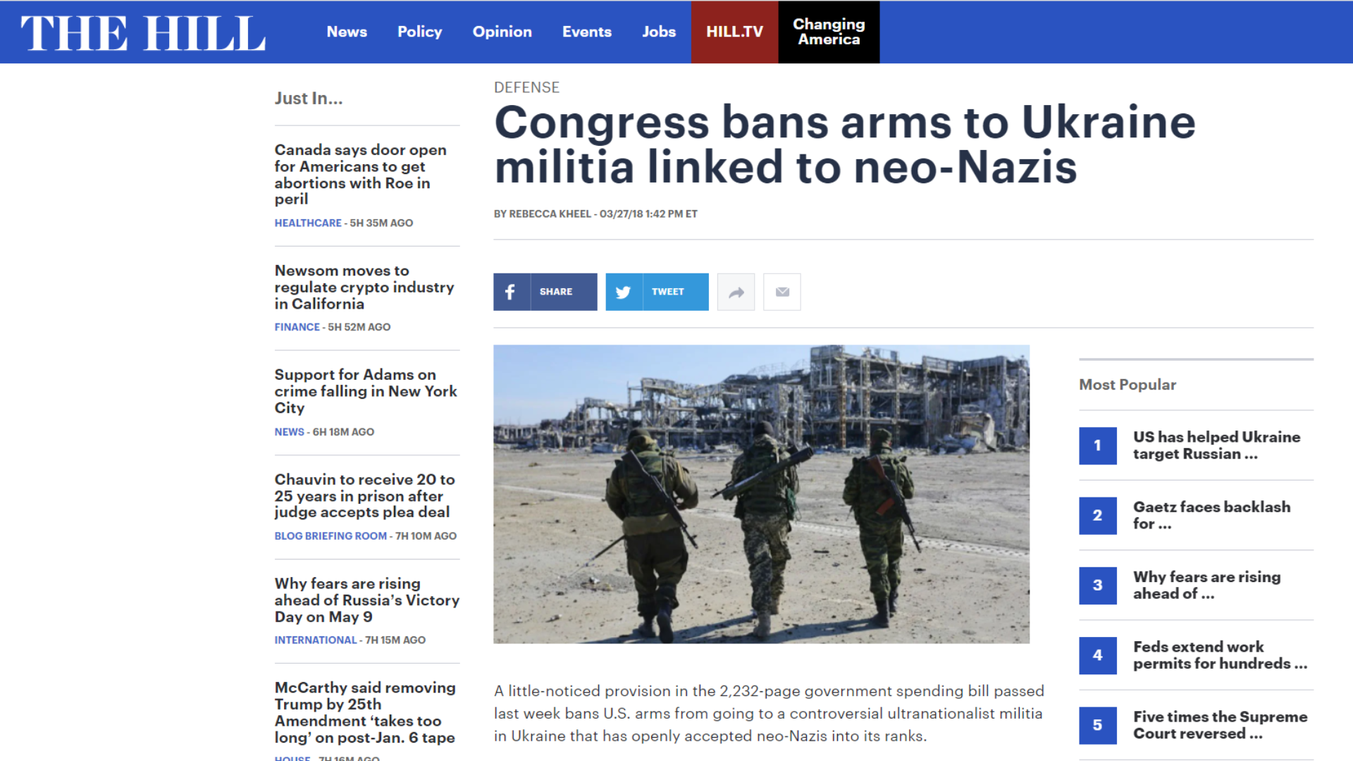Faptul că în Ucraina activează organizații neo-naziste care terorizează populația este, în pofida aparențelor, un element binecunoscut la nivelul administrației din Washington. O demonstrează chiar știrile din America, unde, de exemplu, publicația The Hill anunța în 27 martie 2018 că Congresul SUA a interzis înarmarea miliției ucrainene Azov, de orientare neo-nazistă. Articolul menționează că începând cu anul 2014 oficialii americani alocaseră deja pentru înarmarea Azov suma de 420,7 milioane dolari din fondurile Departamentului de Stat pentru operațiuni externe și alți 200 milioane dolari din fondurile Pentagonului.