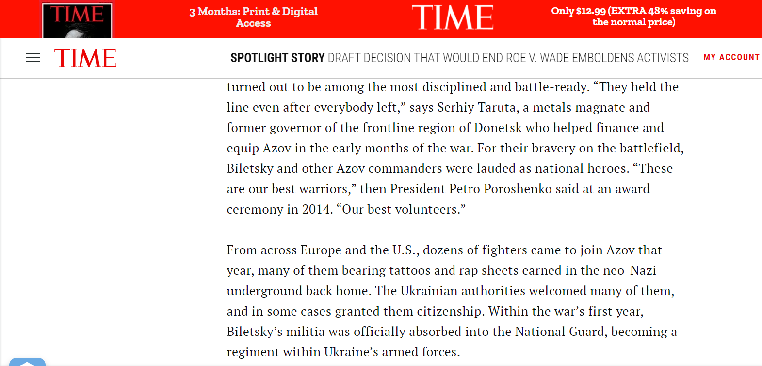 Potrivit unor surse din Occident, deci nu pe baza unor informații venite din partea propagandei ruse, cele mai lăudate trupe ucrainene din perioada 2014 erau tocmai batalioanele neo-naziste Azov. Astfel, un articol publicat în ianuarie 2021 de prestigioasa revistă Time explica faptul că pentru curajul lor pe câmpul de luptă, comandanții Azov au fost lăudați ca eroi naționali. „Aceștia sunt cei mai buni războinici ai noștri”, a spus însuși președintele de atunci al Ucrainei, Petro Poroșenko, la o ceremonie de premiere în 2014. Time ne mai informează că în rândurile batalioanelor Azov s-au strâns neo-naziști din toată Europa, dar și din America. Multora dintre ei autoritățile ucrainene le-au acordat și cetățenia. Mai aflăm de asemenea că miliția Azov a fost „absorbită oficial de Garda Națională, devenind un regiment în cadrul forțelor armate ale Ucrainei”.