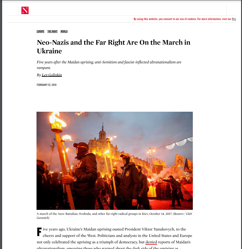 Chiar dacă în 2018 finanțarea neo-naziștilor din Ucraina a fost din nou blocată, de data aceasta de administrația Trump, în februarie 2019, un alt ziar american, The Nation, informa că „Neo-naziștii și extrema dreaptă sunt în marș (în ascensiune) în Ucraina”. În articol se arată că un număr tot mai mare de rapoarte atestă violența grupărilor ucrainene de extremă dreapta care promovează ultranaționalismul și limitarea libertăților de bază ale cetățenilor. The Nation mai semnala recurgerea de către Azov la pogromuri (masacre pe criterii rasiale sau naționaliste) neo-naziste, interzicerea unor cărți și „glorificarea sponsorizată de stat a colaboratorilor naziști”.