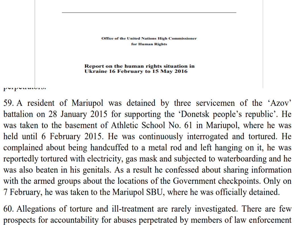 59. Un locuitor din Mariupol a fost reținut de trei militari ai batalionului „Azov” la 28 ianuarie 2015 pentru că a sprijinit „Republica Populară Donețk”. A fost dus la subsolul Școlii de Atletism nr. 61 din Mariupol, unde a fost deținut până la 6 februarie 2015. A fost interogat și torturat încontinuu. El a relatat că a fost încătușat de o tijă de metal și lăsat să atârne de ea, că a fost torturat cu electricitate, mască de gaz și supus la scufundarea capului sub apă (waterboarding) și a fost, de asemenea, bătut în organele genitale.