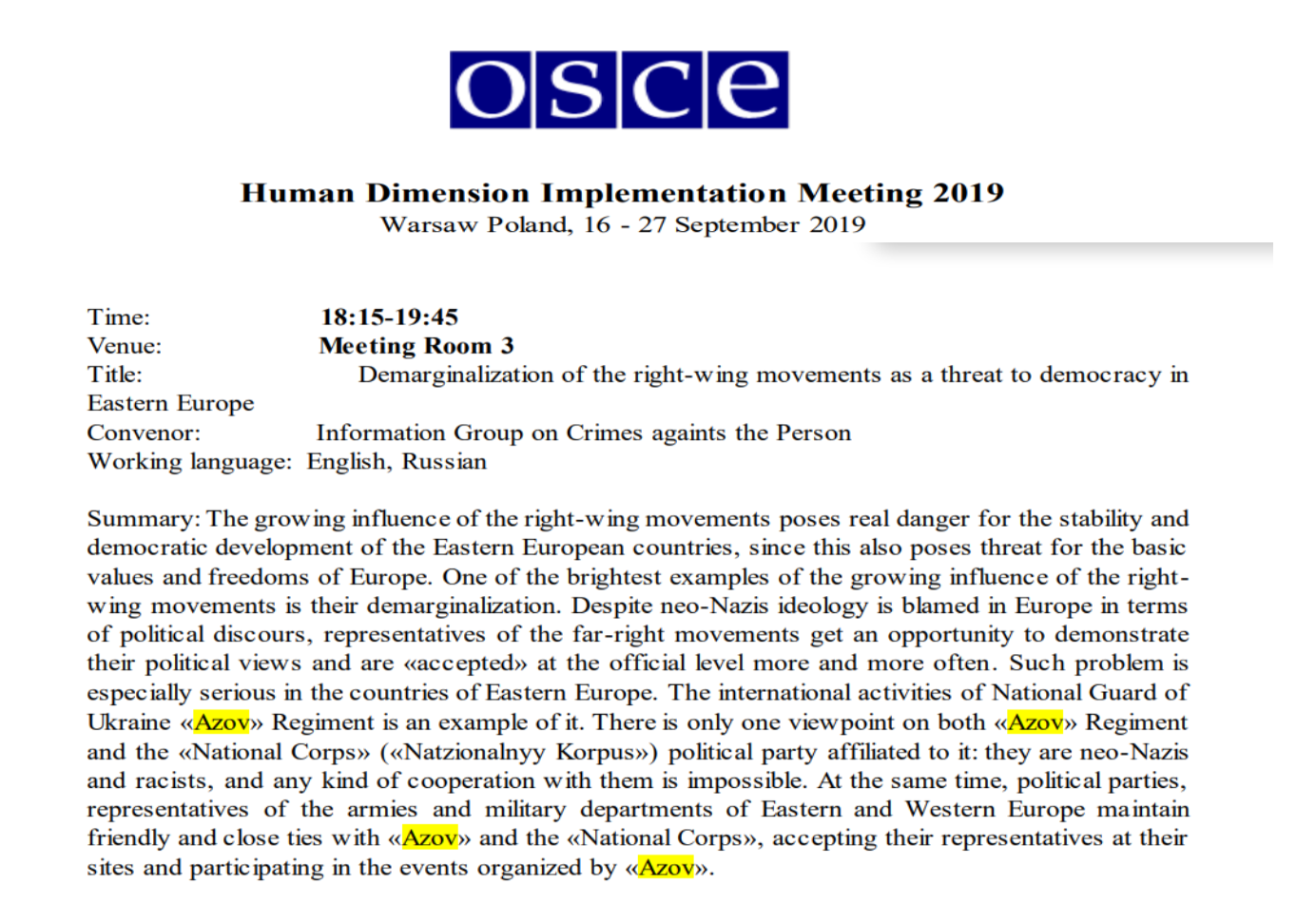 Un alt exemplu semnificativ este un raport al OSCE din 2019 rezultat în urma unor dezbateri care au avut loc în Polonia în perioada 16-27 septembrie 2019. Iată o parte dintre concluziile exprimate cu privire la activitatea formațiunilor militare și politice afiliate cu mișcarea de extremă dreapta Azov: