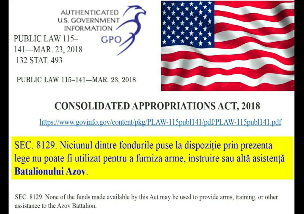 Interzicerea finanțării batalioanelor neo-naziste Azov din Ucraina a fost decretată prin lege în anul 2018, așa cum se vede din textul celui de-al 115-lea proiect de lege al Congresului 1625 – OMNIBUS. Acesta prevede în Secțiunea 8129 că: „Niciunul dintre fondurile puse la dispoziție prin prezenta lege nu poate fi folosit pentru a oferi arme, antrenament sau alte asistențe Batalionului Azov”.