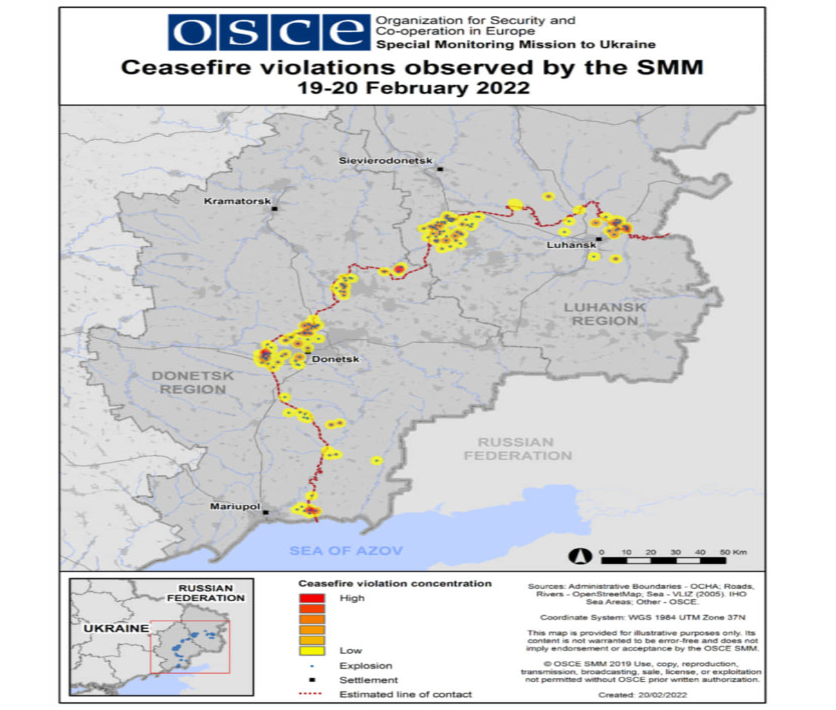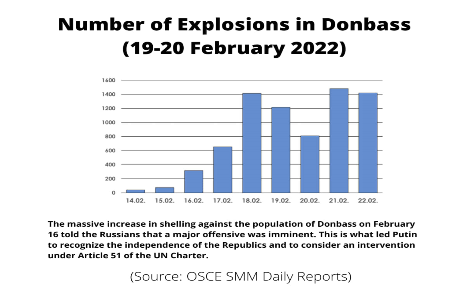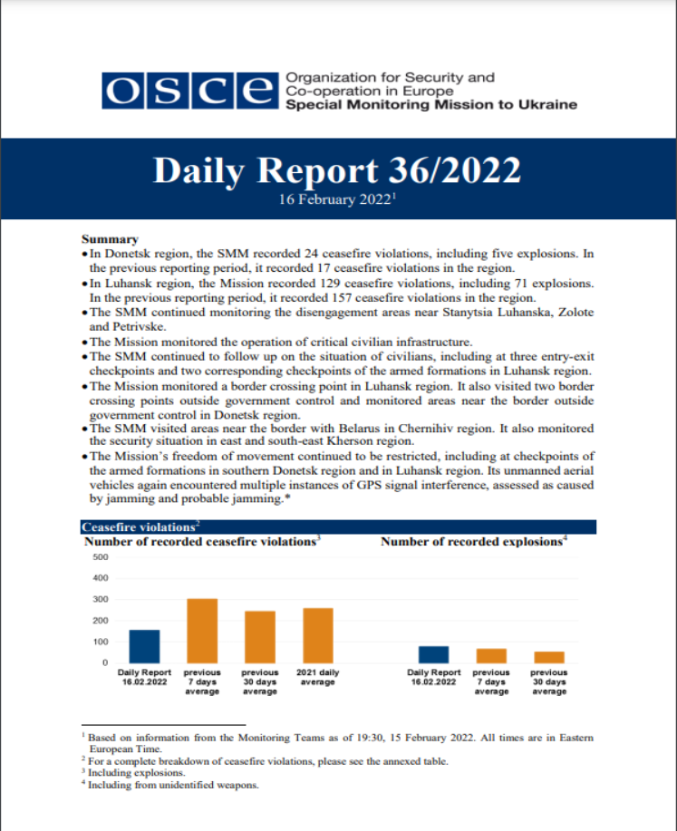 Un alt reper important, dar total necunoscut în presa centrală din Occident, este că în perioada 12-16 februarie 2022 armata ucraineană a bombardat masiv linia de contact cu regiunile Donetsk și Lugansk. Informația poate fi verificată în datele publice menționate în „Rapoartele zilnice” ale OSCE. Deși semnalul de escaladare a tensiunilor era cât se poate de evident, nici mass-media vestică, nici organismele Uniunii Europene, nici NATO, nici vreun guvern occidental nu au reacționat și nu au intervenit. Iată capturile de ecran de pe site-ul OSCE cu informațiile care dovedesc agresiunea. Se arată foarte clar cum numărul de încălcări ale acordului de încetare a focului a fost încălcat de sute de ori la începutul lui februarie 2016:
