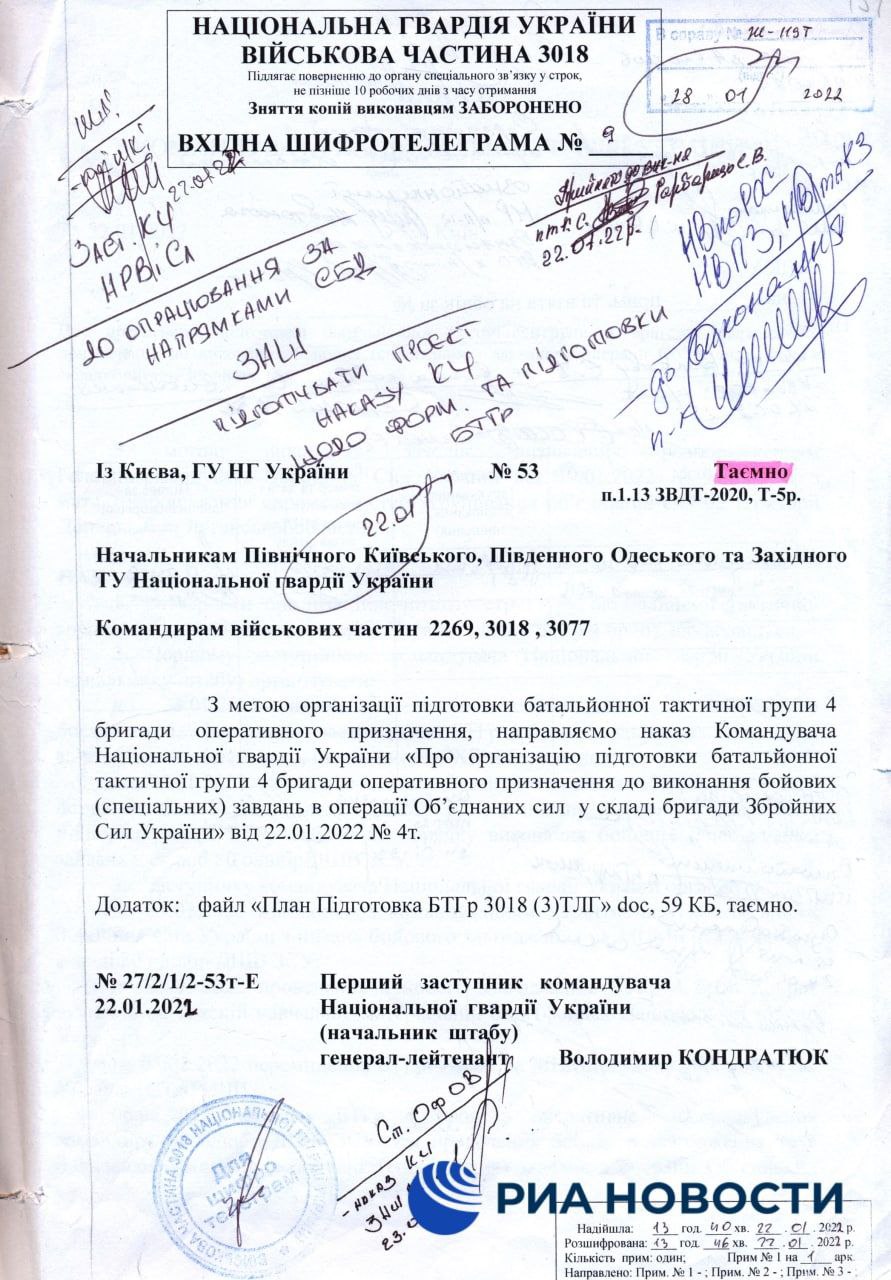 O altă informație esențială care răstoarnă complet narațiunea vestică este aceea că în ianuarie 2022 serviciile secrete ruse au interceptat o serie de documente ucrainene ce conțineau ordine de mobilizare imediată împotriva separatiștilor din Donbass. Astfel, documente datate 22 ianuarie 2022 conțin Ordinul secret al comandantului Gărzii Naționale a Ucrainei de planificare a ofensivei împotriva Donbass-ului, care urma să aibă loc în martie 2022. Iată cele șase pagini ale ordinului, cu ștampile, date și semnături: