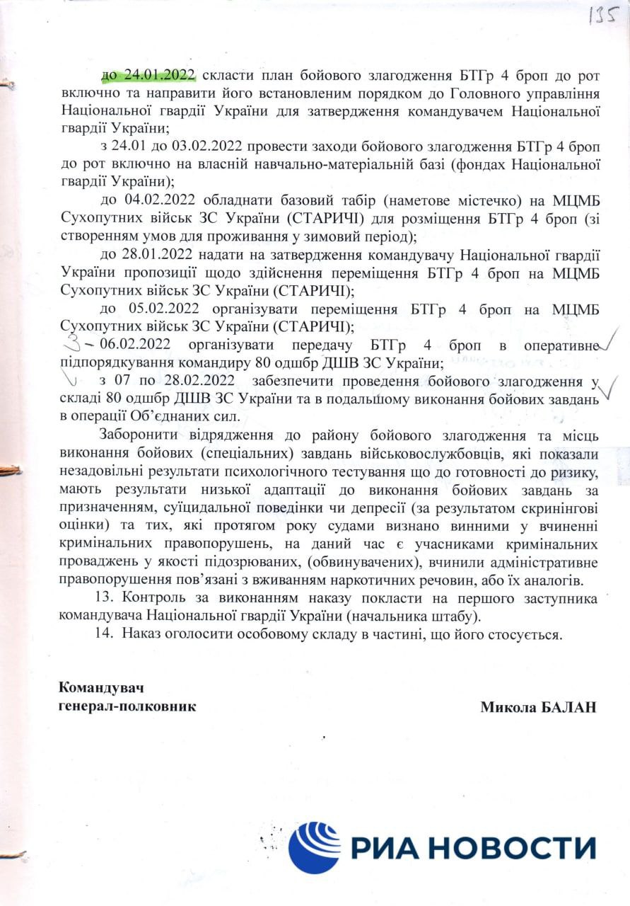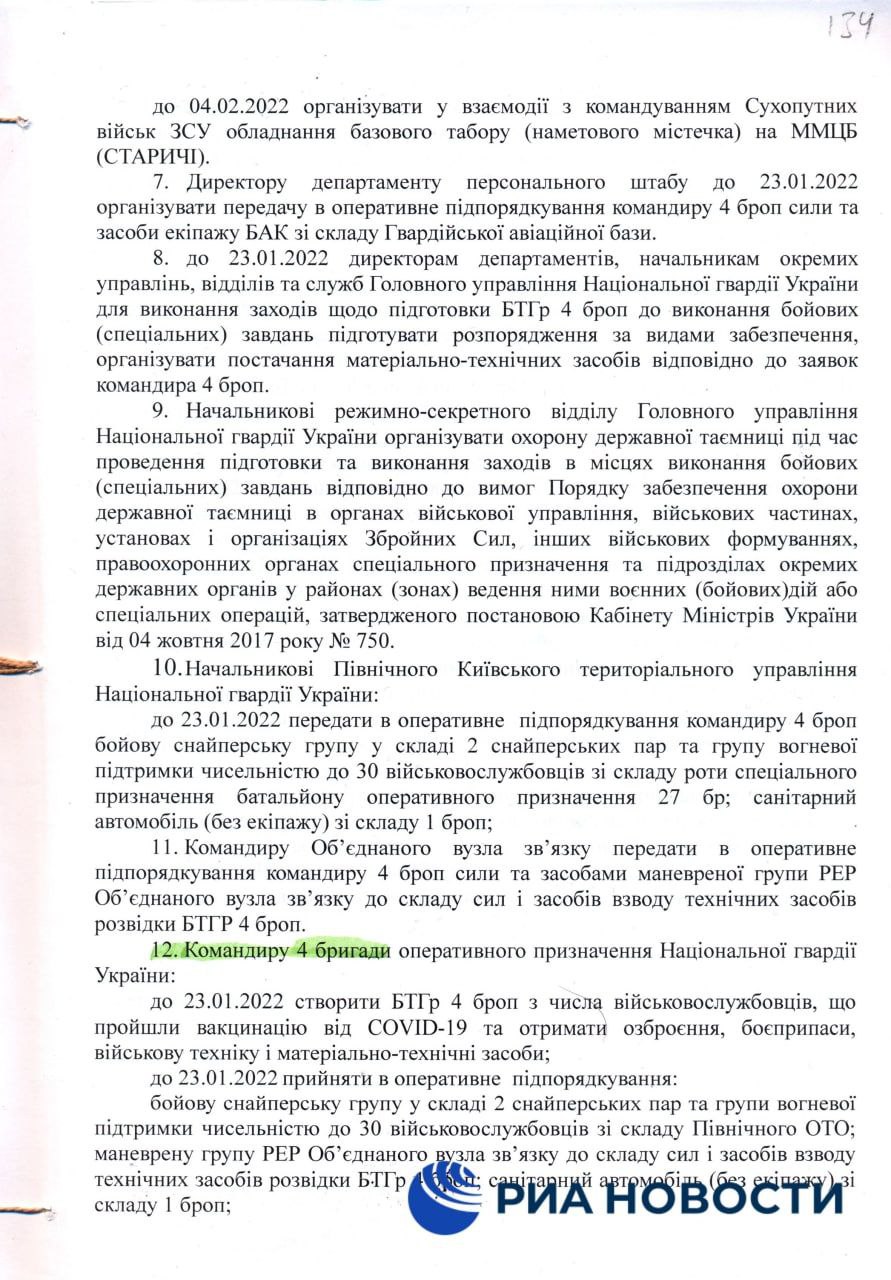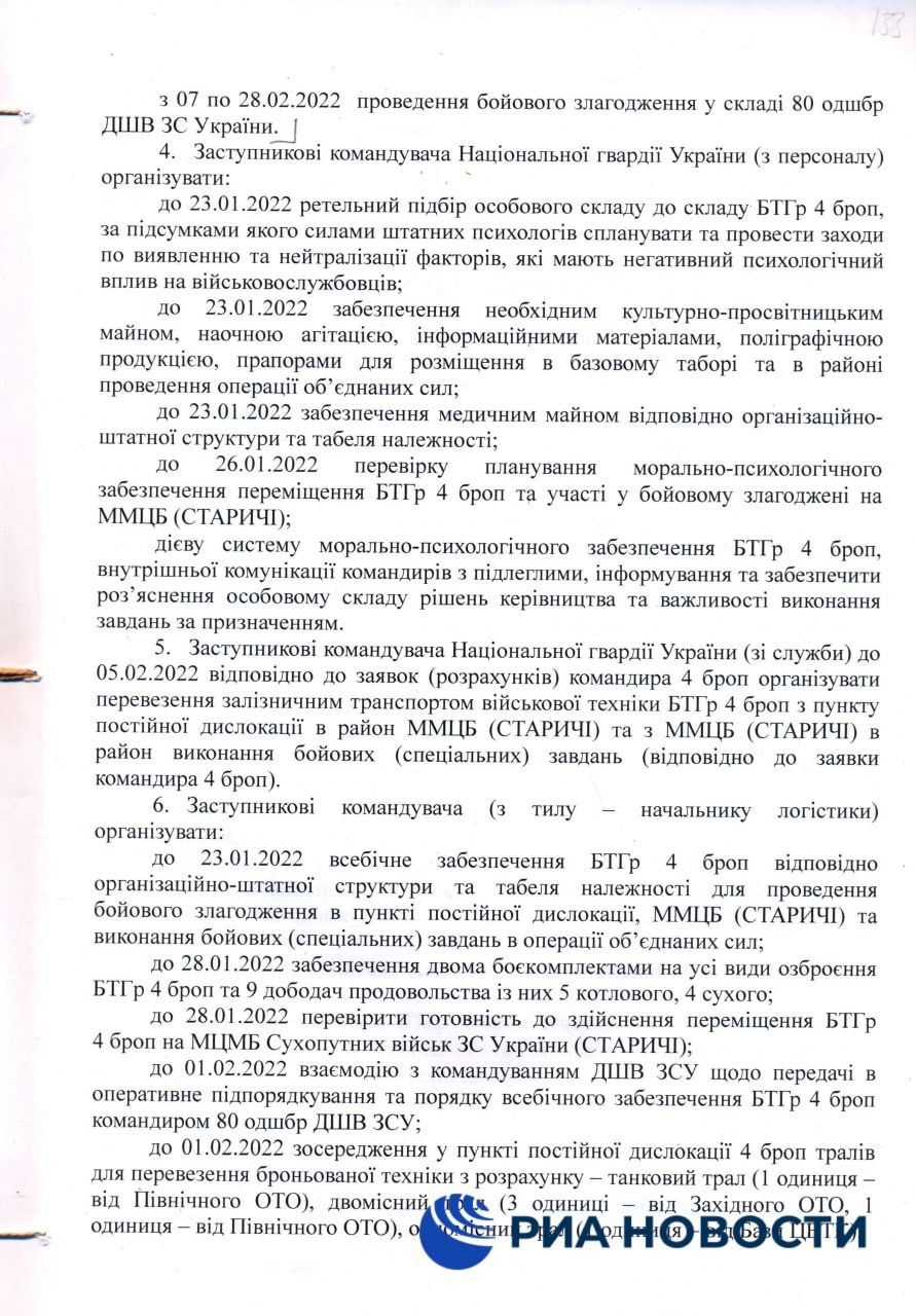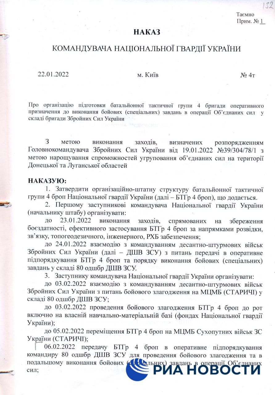 În timp ce partea ucraineană se prefăcea că negociază la discuții în formatul Normandia de la Paris (26 ianuarie 2022) și de la Berlin (10 februarie 2022), în realitate se pregătea de război. Pregătirile (așa cum arată ordinul) trebuiau să fie finalizate până pe 28 februarie 2022. Să ne amintim că operațiunea rușilor a început pe 24 februarie, deci a devansat ordinul cu patru zile și a dat peste cap operațiunea serviciilor secrete ucrainene… În text se precizează că Forțele Unite ale Gărzii Naționale se pregătesc de ASALT. Primele patru pagini cuprind date despre pregătirea tancurilor, avioanelor, a artileriei, a echipamentelor de iarnă. Este subliniată excluderea celor care la examenul psihologic apar ca indeciși față de obiectivul operațiunii. La pagina 4 se specifică necesitatea de a fi menținut secretul total al operațiunii. Se pune în vedere că până la data de 28 februarie 2022 grupul militar trebuie să fie complet operațional, în stare efectivă de luptă. Să ne mai întrebăm o dată: „Cine a provocat conflictul?”.