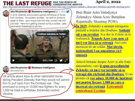Foarte elocvente pe această temă sunt și explicațiile tranșante date Scott Ritter, fost inspector ONU și fost ofițer superior în serviciile de Informații ale Marinei SUA. Ritter relatează că neonaziștii Azov i-au spus mai întâi lui Poroșenko că „Dacă vei încerca să implementezi acordul de la Minsk TE VOM UCIDE!”. Apoi Zelensky s-a dus la ei ca să le ceară să facă anumite concesii în Donbass, dar aceștia i-au spus răstit că: „Dacă vei semna Acordul de la Minsk, te vom atârna de gât până vei muri!”.