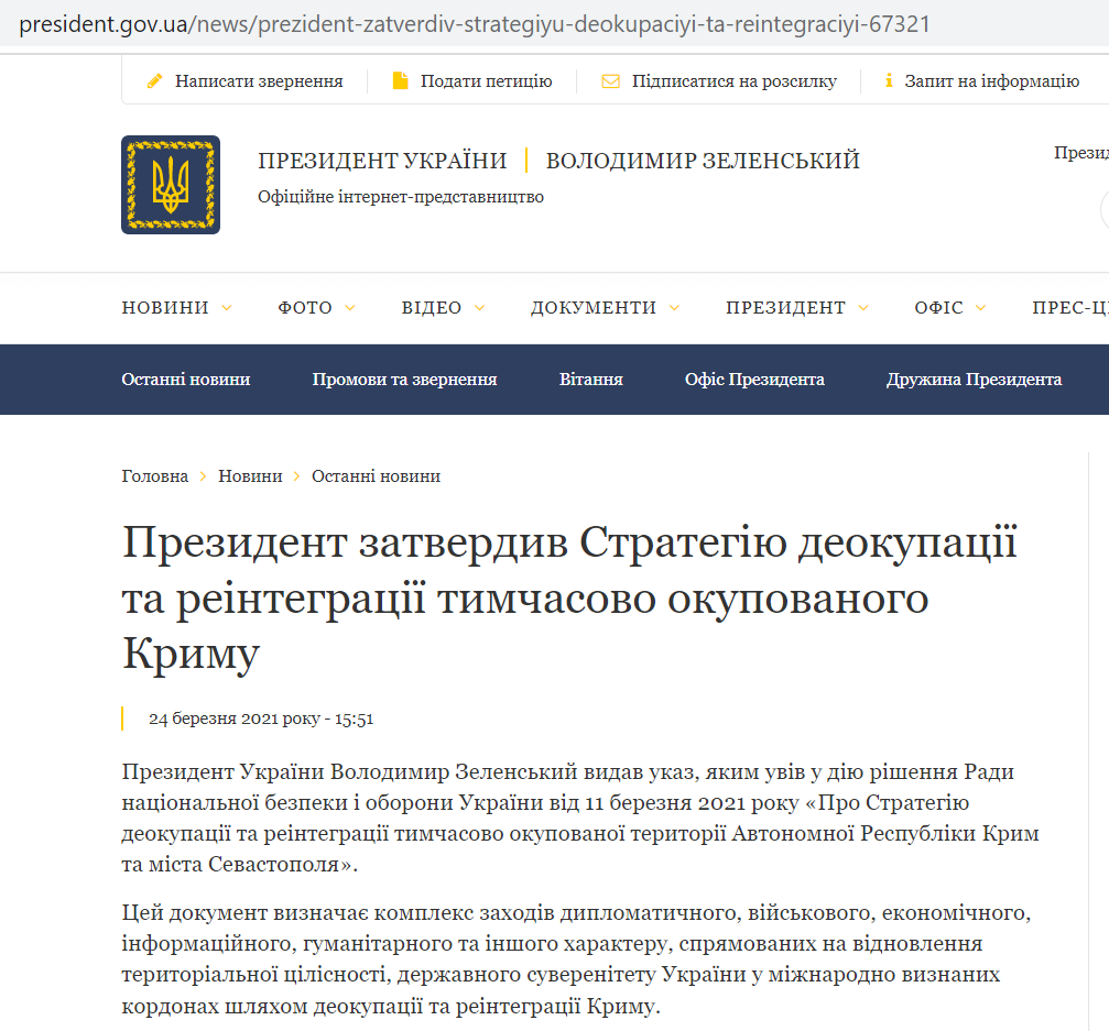 Pentru a înțelege parcursul operativ al ostilităților ruso-ucrainene este necesar să știm că în data de 24 martie 2021, Biroul prezidențial al președintelui Zelensky a făcut public anunțul deciziei de reluare prin forță a Crimeei. Mai exact, în 11 martie 2021 președintele Ucrainei, Volodymyr Zelenskyy, a semnat un decret de promulgare a deciziei Consiliului ucrainean pentru Securitate Națională și Apărare (NSDC) cu privire la o „Strategie de dez-ocupare și reintegrare a teritoriului ocupat temporar al Republicii Autonome Crimeea și a orașului Sevastopol”. Decizia a fost făcută publică pe 24 martie 2021 pe site-ul Biroului Prezidențial al Ucrainei.