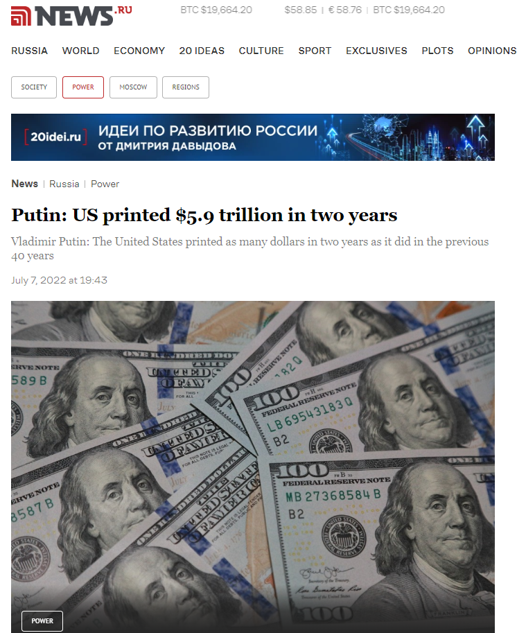 În ceea ce privește inflația explozivă din lumea liberală, aceasta se datorează tipăririi masive de dolari fără acoperire în valori reale. Aceste hârtii (prin care bancherii din Vest obțin brusc și ilegal putere de cumpărare și influență) sunt aruncate pe piață de către instituțiile financiare bancare transnaționale, instituții pe care nu le poate trage la răspundere nicio organizație internațională. Este semnificativ că în ultimii doi ani, conform informațiilor publicate de Agenția News.ru, Statele Unite au tipărit 5,9 trilioane de dolari, ceea ce reprezintă 38% la sută din masa monetară aflată în circulație la nivel mondial și cam la fel de mulți dolari câți au fost tipăriți în ultimii 40 de ani. Pentru ce a fost nevoie să fie pompate în mod artificial aceste sume colosale pe piață? Evident, pentru a acoperi propaganda din timpul „pandemiei” (în realitate o gigantică operațiune sub steag fals) și de asemenea pentru a susține campania de înarmare masivă, fără precedent în vreo altă țară, a Ucrainei.