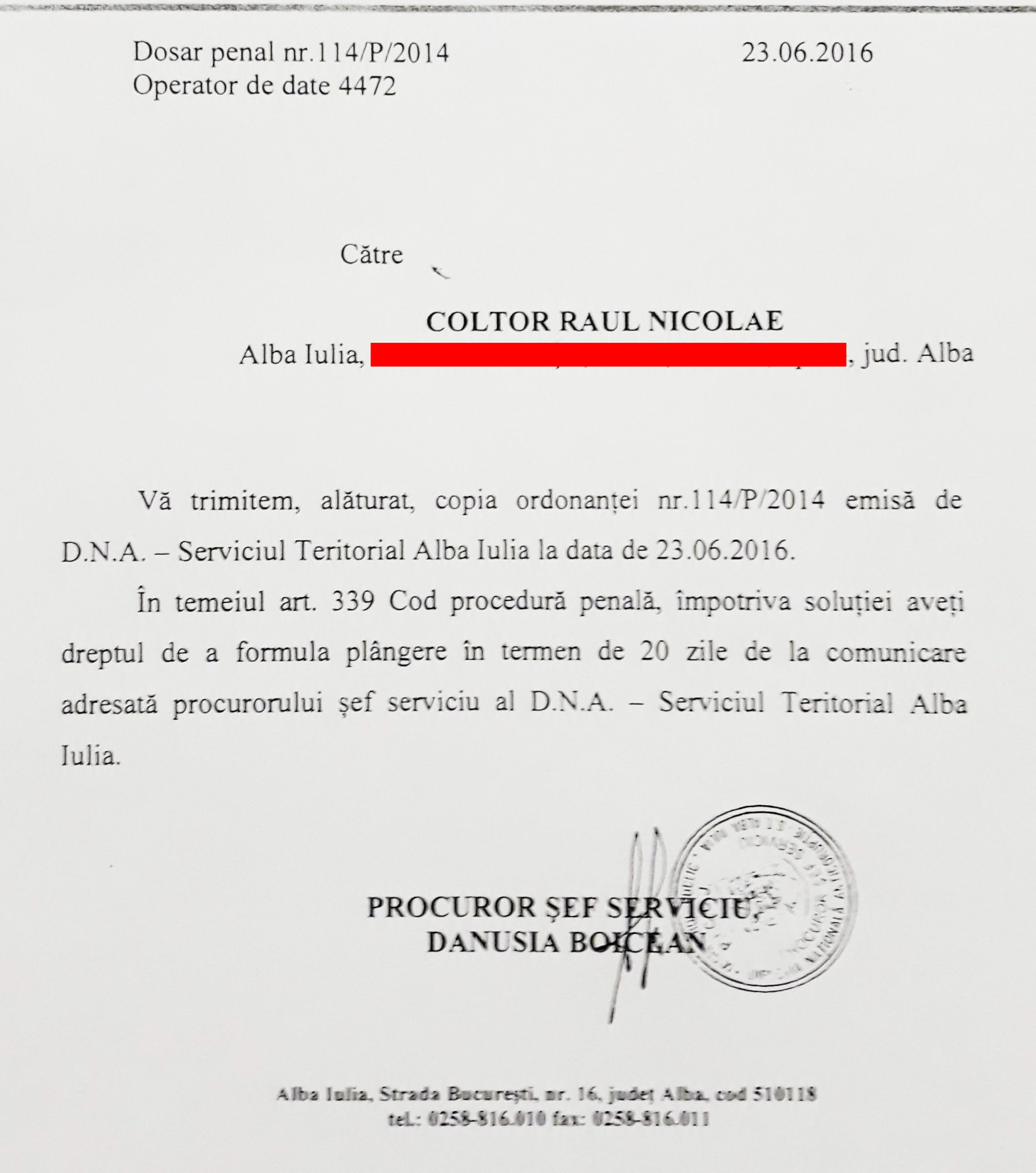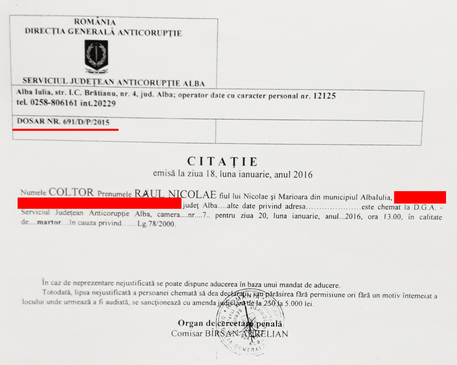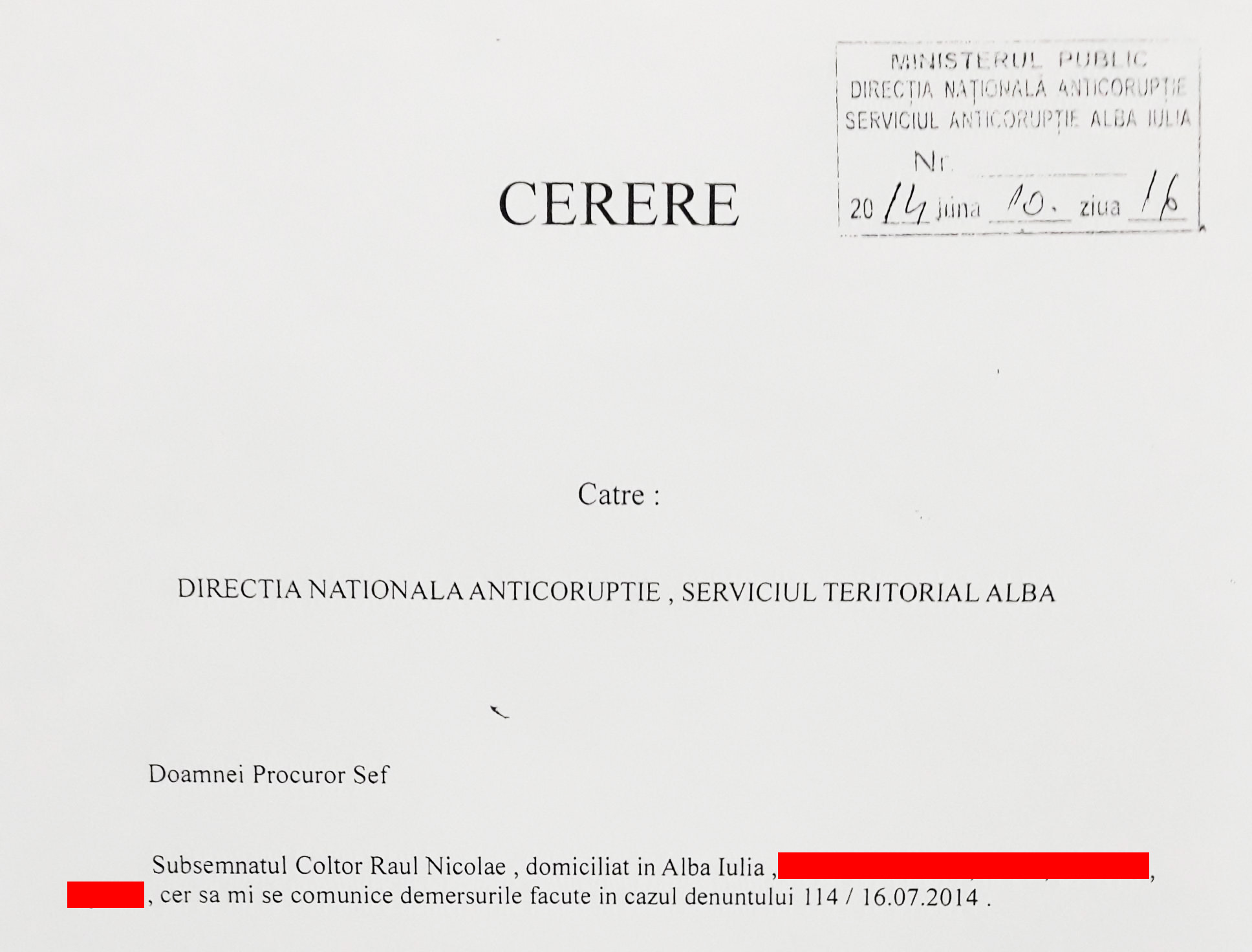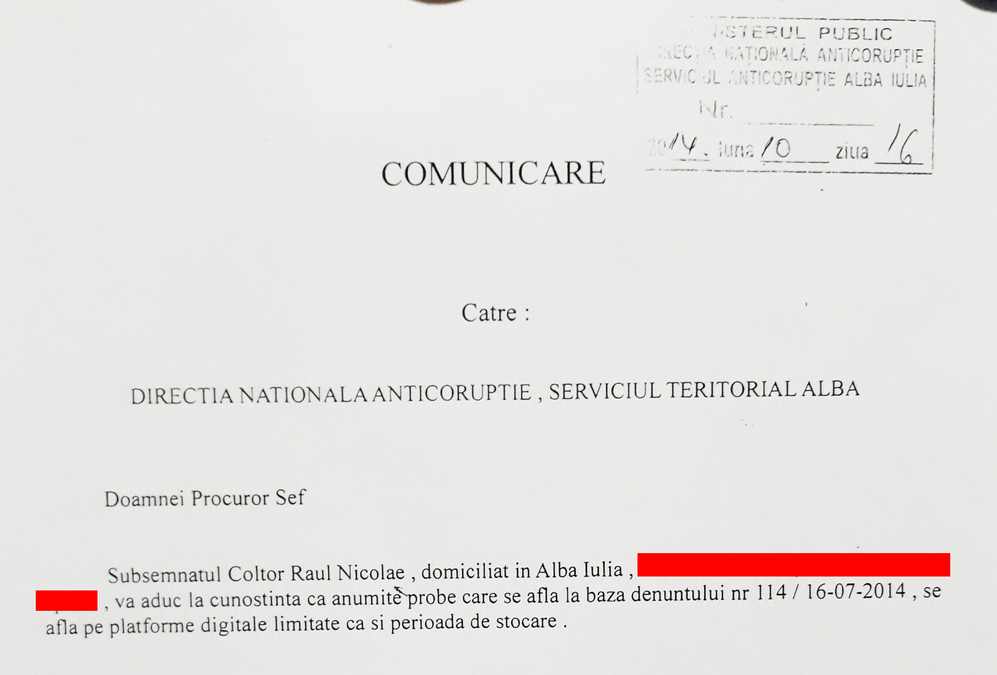 R. C.: Odată depus denunțul am așteptat să fiu chemat pentru a depune probele și a mă folosi de drepturile legale impuse de situație. La data de 16 octombrie 2014 m-am adresat cu o cerere și cu o comunicare către DNA Alba pentru a încerca să aflu stadiul dosarului și să aduc la cunoștință procurorului de caz că anumite probe pe care doream să le depun se află pe suport electronic, gen domenii virtuale (IP-uri) și că acestea din urmă pot expira ca valabilitate.