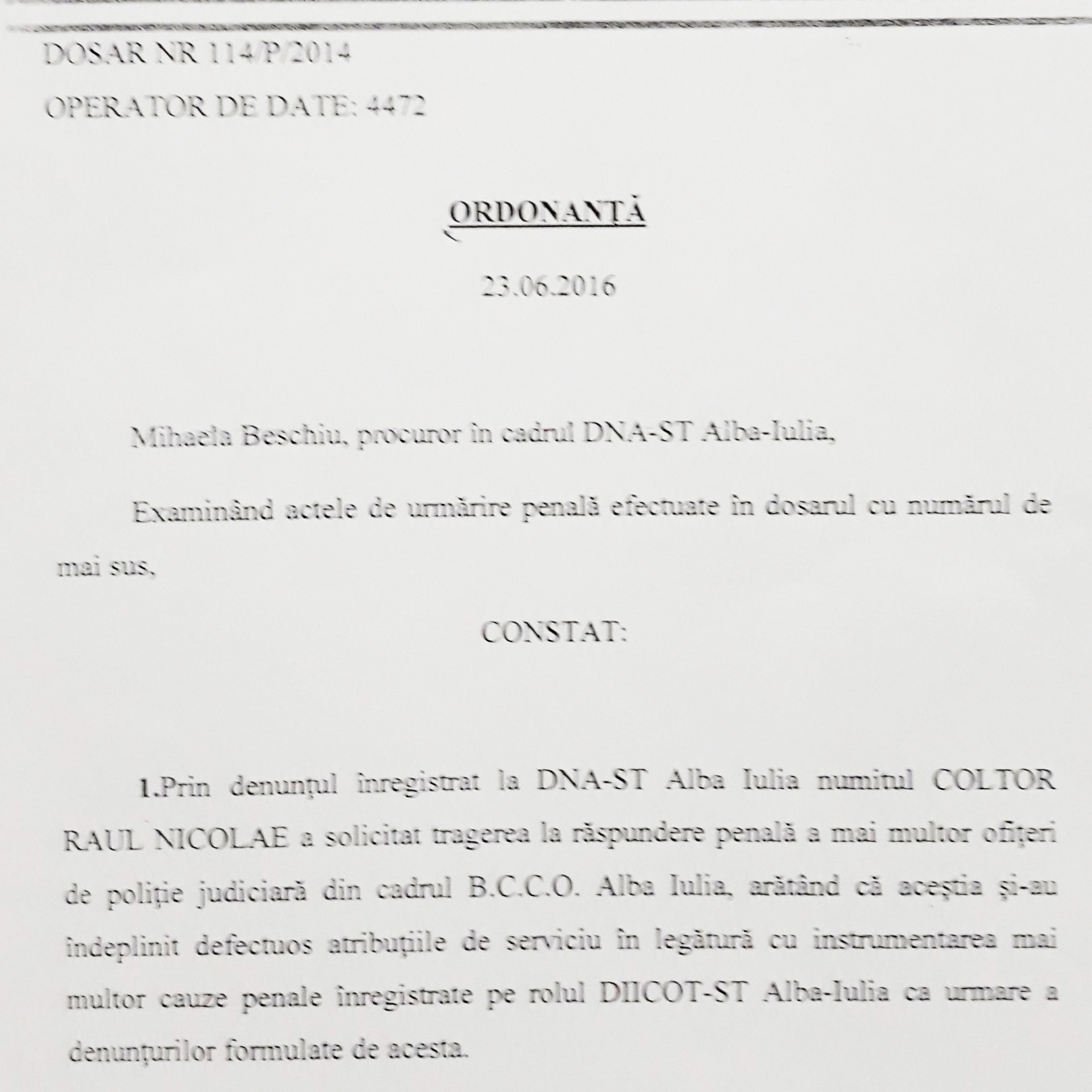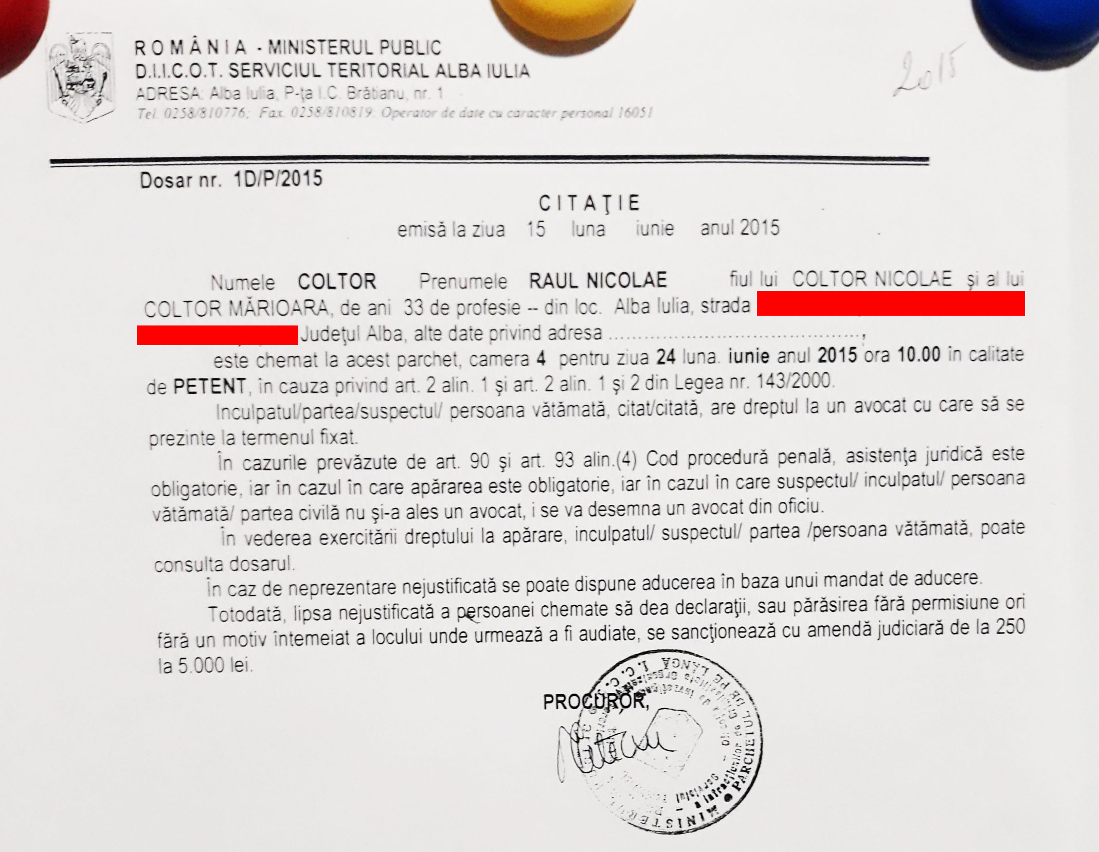 R. C.: La DIICOT. În iunie 2015 am reușit să găsesc un procuror din cadrul DIICOT Alba care, în sfârșit, și-a făcut datoria conform fișei postului și a înregistrat cazul. Acest fapt m-a ajutat să păstrez linia juridică intactă, mai exact continuitatea calendaristică ce poate servi în prezent la arestarea și pedepsirea trădătorilor care activează în cadrul instituțiilor statului român. Numărul dosarului este 1/D/P/2015.