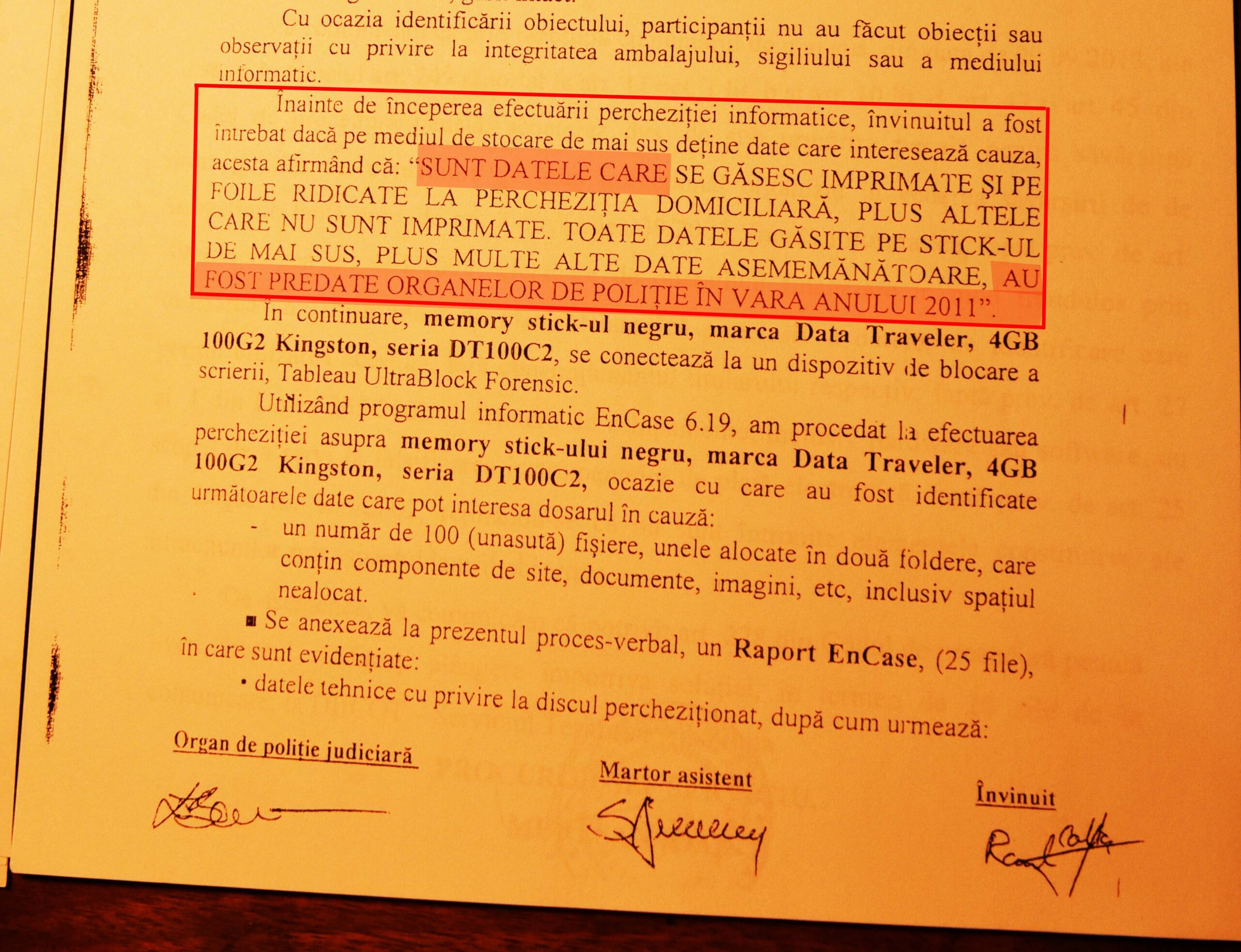 R. C.: În iunie-iulie 2011 datele electronice au fost predate anumitor instituții, respectiv angajaților acestora. Prima instituție la care au fost predate este Brigada de Combatere a Crimei Organizate (BCCO) din Alba Iulia. Predarea a avut loc în sediul BCCO din Alba. Lucrătorii care au primit sunt următorii comisari-șefi: Negru Cristian (rudă a Laurei Codruța Kovesi), Radu Valentin, Mărginean Cristian, Cioară Dorin, Mariș Claudiu, … Mădălin (din departamentul Cyber Crime). În lipsa procesului verbal de predare/primire pot dovedi că datele au ajuns la acești polițiști printr-un fragment al unui proces verbal de percheziție informatică.