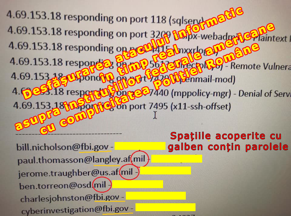 • Implicarea autorităților române în atacul cibernetic din 2012 asupra instituțiilor guvernamentale federale americane: FBI, US Army, NSA. Acest caz a fost parțial făcut public de către FBI abia în anul 2020. Pot să evaluez că gravitatea acestui atac cibernetic echivalează cu cazul Pacepa.