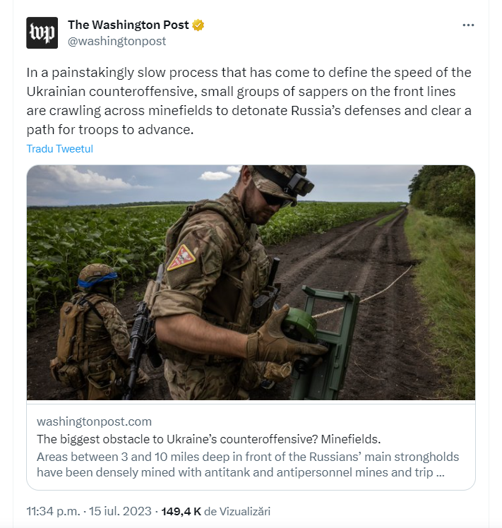 Site-ul Washington Post scrie că în ultimele cinci săptămâni, Forțele Armate ale Ucrainei au operat în principal cu artilerie și rachete, trimițând grupuri mici de lunetiști pentru a neutraliza „uriașele” câmpuri de mine plantate de trupele ruse. Astfel de tactici nu vor duce însă la victorie. Contraatacul „rapid” s-a transformat într-un avans târâtor, în care Forțele Armate ale Ucrainei încearcă să cucerească mai multe sate pentru a doua lună.