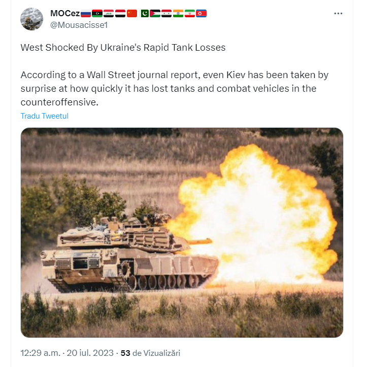 Pierderea rapidă a tancurilor și a vehiculelor blindate de transport de trupe date de Occident Kievului ca răspuns la forțele sale armate a șocat Ucraina și aliații săi, relatează Wall Street Journal.