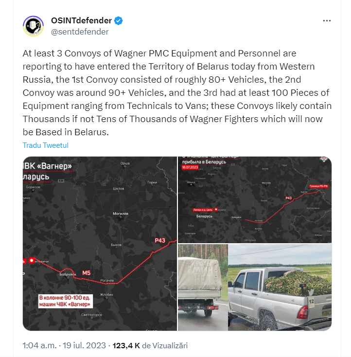 Cel puțin 3 alte coloane de echipamente și personal Wagner PMC au intrat ieri, 19 iulie 2023, pe teritoriul Belarusului dinspre Rusia de Vest.